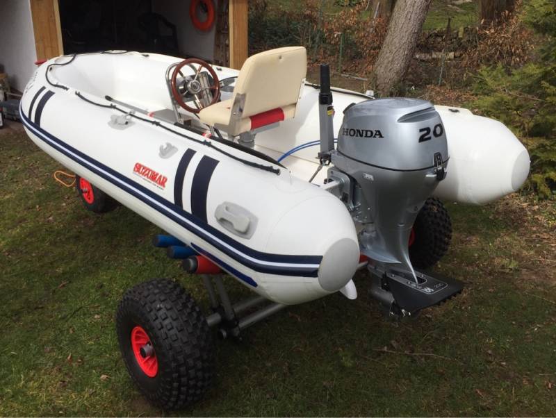 Der RIB Trax Hafen-Trailer, der auch vom DLRG verwendet wird, ist der BESTE der auf dem Markt erhältlich ist; komplett aus Edelstahl und Alu, leicht und stabil, Neupreis knapp 1100,-Euro (Rechnung mit Garantie vorhanden!). Aufpreis liegt bei nur 600,-Euro falls gewünscht.