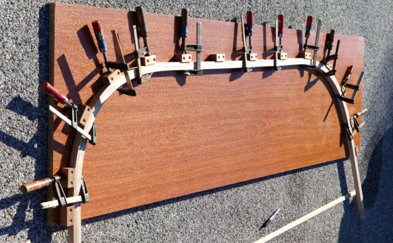 Das kommt mal wieder auf das Holz an, langfaserige zum biegen an sich schon gut geeignete Hölzer wie Rüster(Esche) oder astreine Nadelhölzer(Oregonpine, Kiefer) können dickere Lamellen sein so um Biegeradius:100 oder 150 sonst in etwa Biegeradius:200. Mit Mahagoni habe ich für meine Schottdurchgangsöffnungen Biegeradius 250mm das auch mit 2,5mm Lamellen hinbekommen, habe aber geschummelt und die etwas warm und feucht gemacht(Heißluftpischtole) anschließend wg. Farbe mit Phenolresorcin/Bootsbauleim verleimt. Versuch macht bekanntlich klug. Irgendwann hört der Spaß auf weil man dann Lamellen hat die dünner sind als das Kreissägeblatt. Ein Ausweg ist dann mit dickeren Messerfurnieren zu arbeiten.