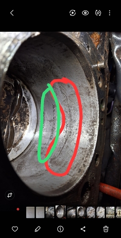 Ist hier ein Riss (rot) im Zyl. 6? Man spürt nichts, aber ggf kann Wasser durch kommen wenn er sich durch Wärme dehnt .. Kann dann das Wasser über Einlassventil von Zyl. 6 in Zyl. 5 kommen? Eine gewisse Überschneidung ist vorhanden.