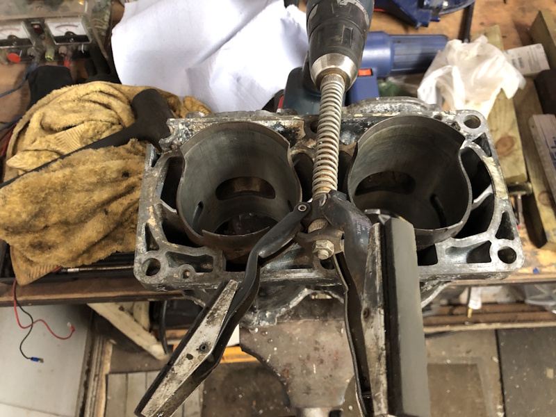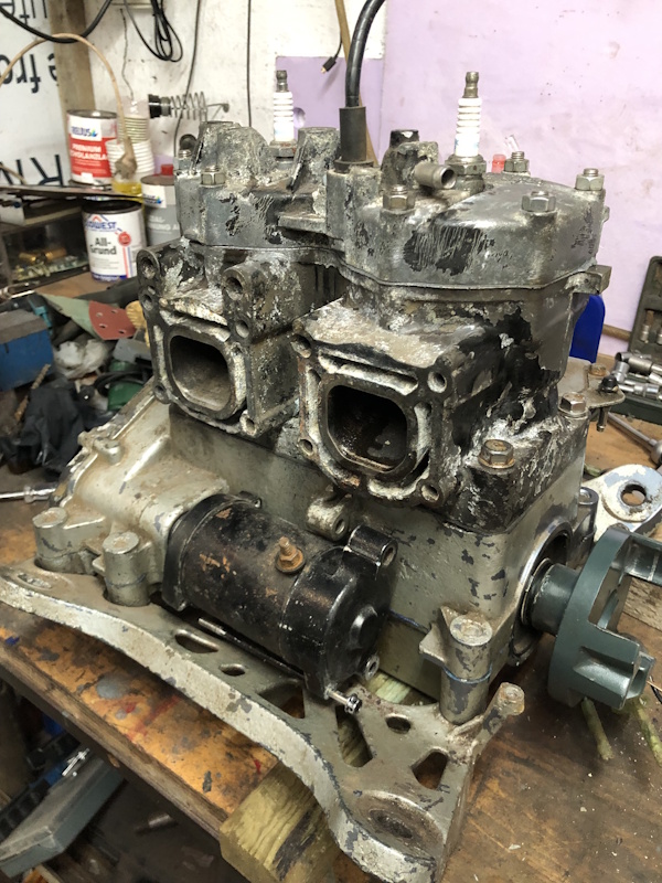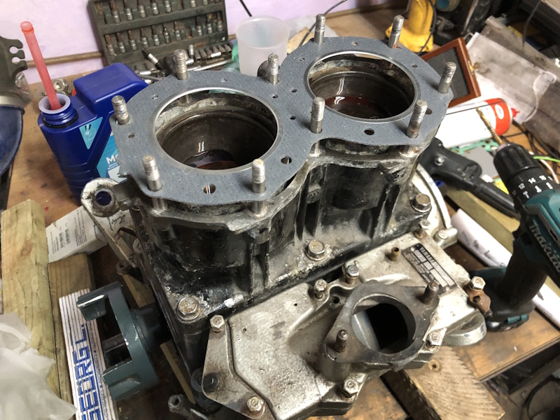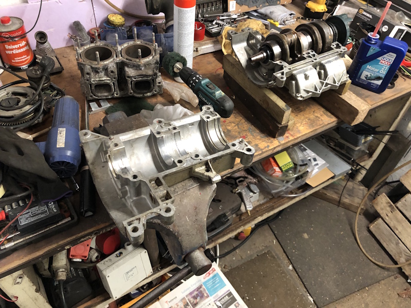 Ich wollte dieses 700er Yamaha Teilepuzzle schon lange mal zusammensetzen, eigentlich mit neuen Kolben und Ersatzzylinder. ![]() ![]() Ein brauchbarer Zylinder ist mir leider, trotz intensiver Bemühungen, bis jetzt nicht über den Weg gelaufen. Also gibt es als Zwischenschritt einen Funktionstest mit dem alten Top-End, auch wenn es wirklich gruselig aussieht.