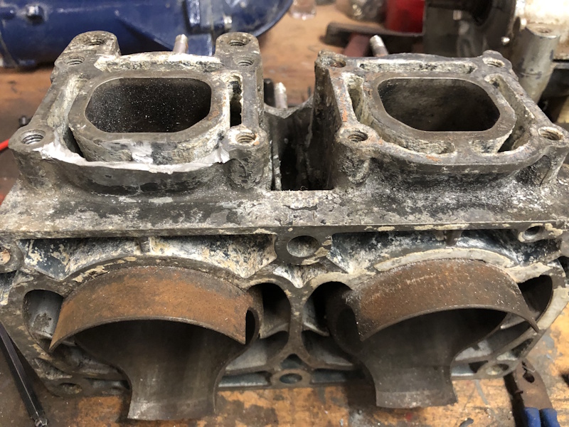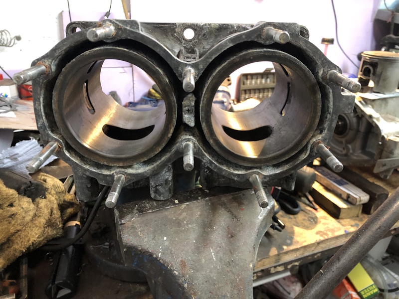 Der Zylinder ist rein äusserlich eigentlich ein Fall für die Schrott-Tonne. Kühlkanal ist ausgebrochen, eine Ecke am Fuß wurde offenbar abgeflext... aber die Laufbuchsen haben zumindest keine schlimmen Macken.